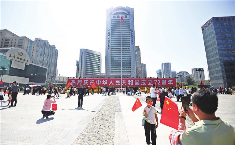 五一廣場呈現出一派花團錦簇的景象,造型美麗的花壇為節日的并州增添了喜慶、歡樂、祥和的氣氛。國旗臺南側,大幅標語“熱烈慶祝中華人民共和國成立72周年”格外醒目,它的前面,一串紅、萬壽菊等鮮花在陽光的照射下熠熠生輝,人們紛紛走到這里拍照留念。“祝愿祖國越來越好!”太原市第二實驗小學六年級學生劉珈彤站在國旗臺前,笑盈盈地和飄揚的五星紅旗合影。