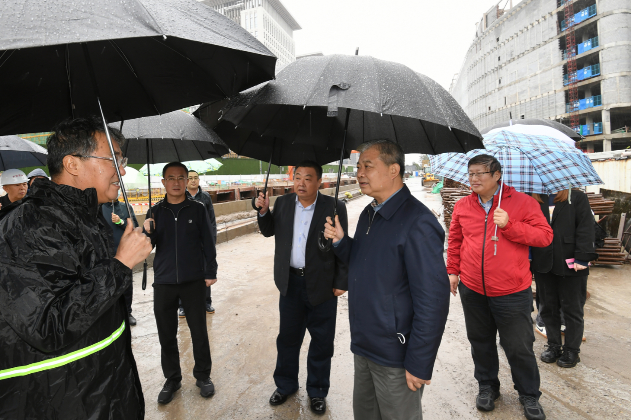 圖為省委常委、市委書記羅清宇在軌道交通晉陽街預留換乘車站施工工地督導檢查防汛工作。梁琛 攝