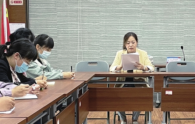 段榮芳(右一)帶領(lǐng)社區(qū)工作人員學(xué)習(xí)黨代會(huì)報(bào)告。(圖片由受訪者提供)