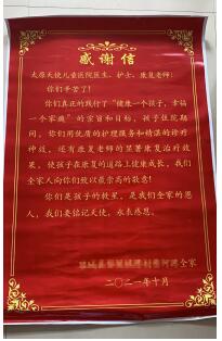 錦旗與感謝信,是患兒與家屬對醫護人員精湛醫術和服務水平的肯定和贊揚,更是對太原天使進一步提升醫療服務質量的最大鞭策。朱院長表示:0-6歲是幼兒康復的黃金時期,早發現、早診斷、早干預。康復治療是一個緩慢的過程,專業的治療手段加上患兒家屬的積極配合和長期堅持,治療效果一定會事半功倍。
