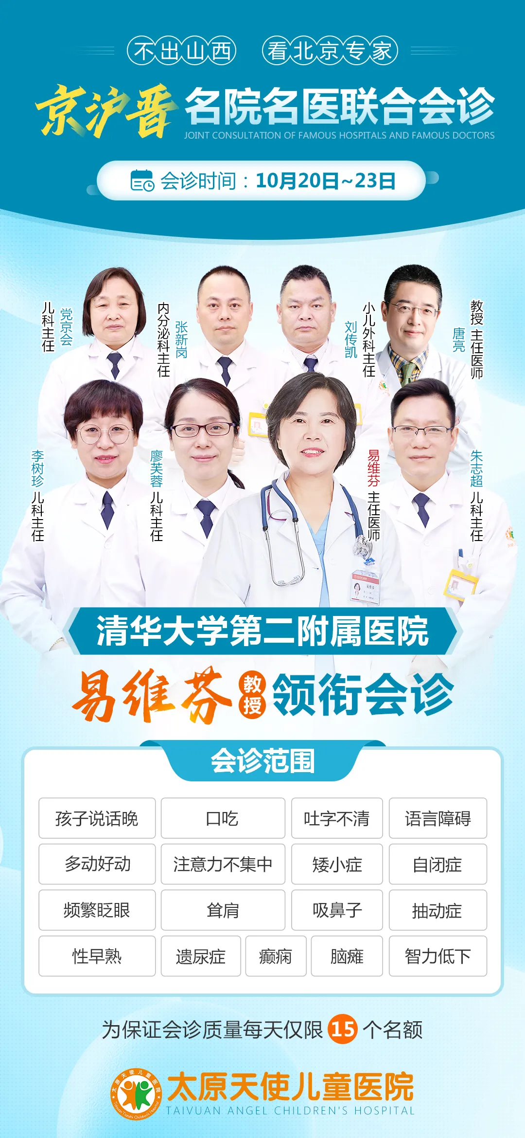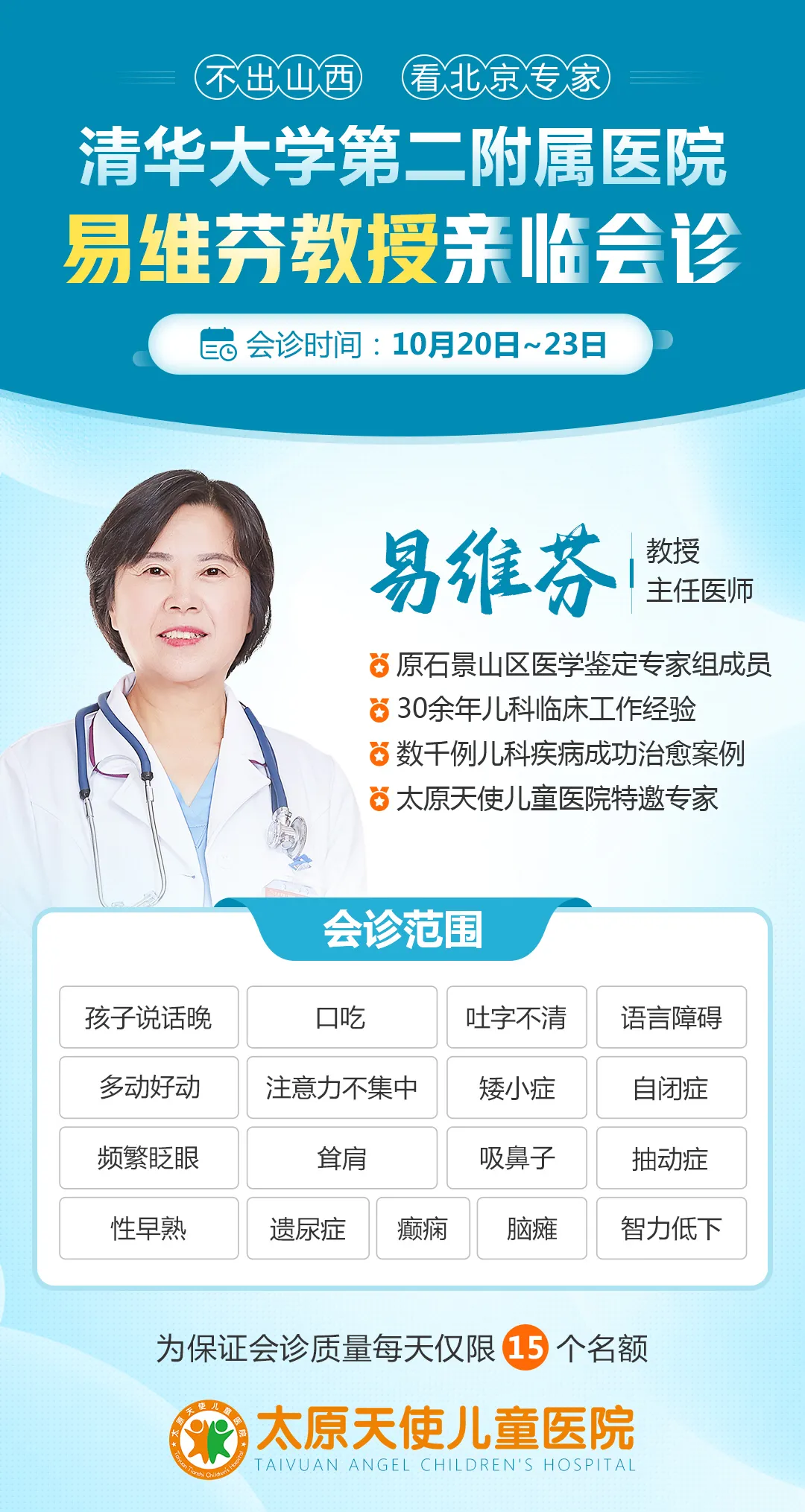 最近,隨著氣溫逐步變冷,溫差變化較快。兒童抽動癥、多動癥、語言發育遲緩等兒科疾病的門診量逐步上升。為了解決廣大家長的困擾,方便山西及周邊地區的患兒能夠接受更好的診療服務,太原天使兒童醫院10月20日——21日邀請北京清華大學第二附屬醫院易維芬教授來晉會診。