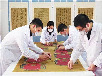 除了壁畫修復室外,文物保護研究部還有金屬、陶瓷、書畫、古籍、石質(zhì)文物修復保護研究室,具有玉、陶器、瓷器、銅器、鐵器、金銀器、壁畫、飽水漆木器、干燥漆木器、石刻磚瓦、甲骨等文物保護修復資質(zhì)。郭智勇說:“‘十三五’期間,我們部門修復文物5000余件,保養(yǎng)文物3000多件。”