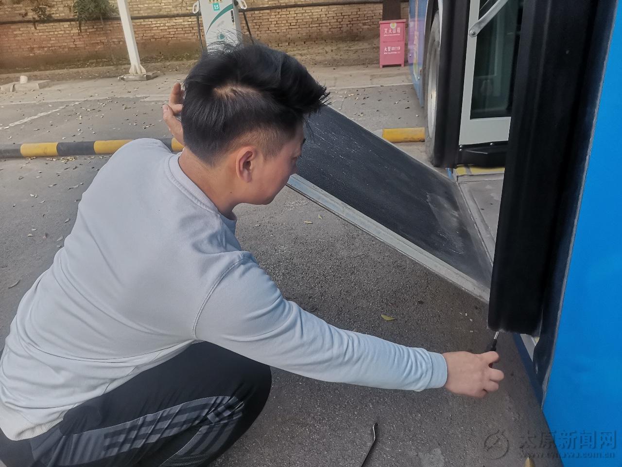 在一輛602路公交車上,修理工白永平將位于后門的輪椅翻板拆開,清理著下面堆積的碎屑和垃圾。“輪椅翻板是純電動(dòng)公交車上一個(gè)非常人性化的設(shè)計(jì)。以前的車輛沒有翻板,當(dāng)有乘客乘坐輪椅上車時(shí),駕駛員只能先把乘客抱上車,再把輪椅抬上去。如今只需將輪椅翻板打開,將乘客和輪椅一起推上去就可以了。”白永平一邊干活一邊介紹道,但輪椅翻板使用一段時(shí)間就需要維護(hù),尤其是翻板下面特別容易堆積灰塵和碎屑,不定期清理會(huì)導(dǎo)致翻板打開不暢,嚴(yán)重時(shí)還會(huì)導(dǎo)致翻板銹死報(bào)廢,造成安全隱患。所以,輪椅翻板維護(hù)特別有必要。