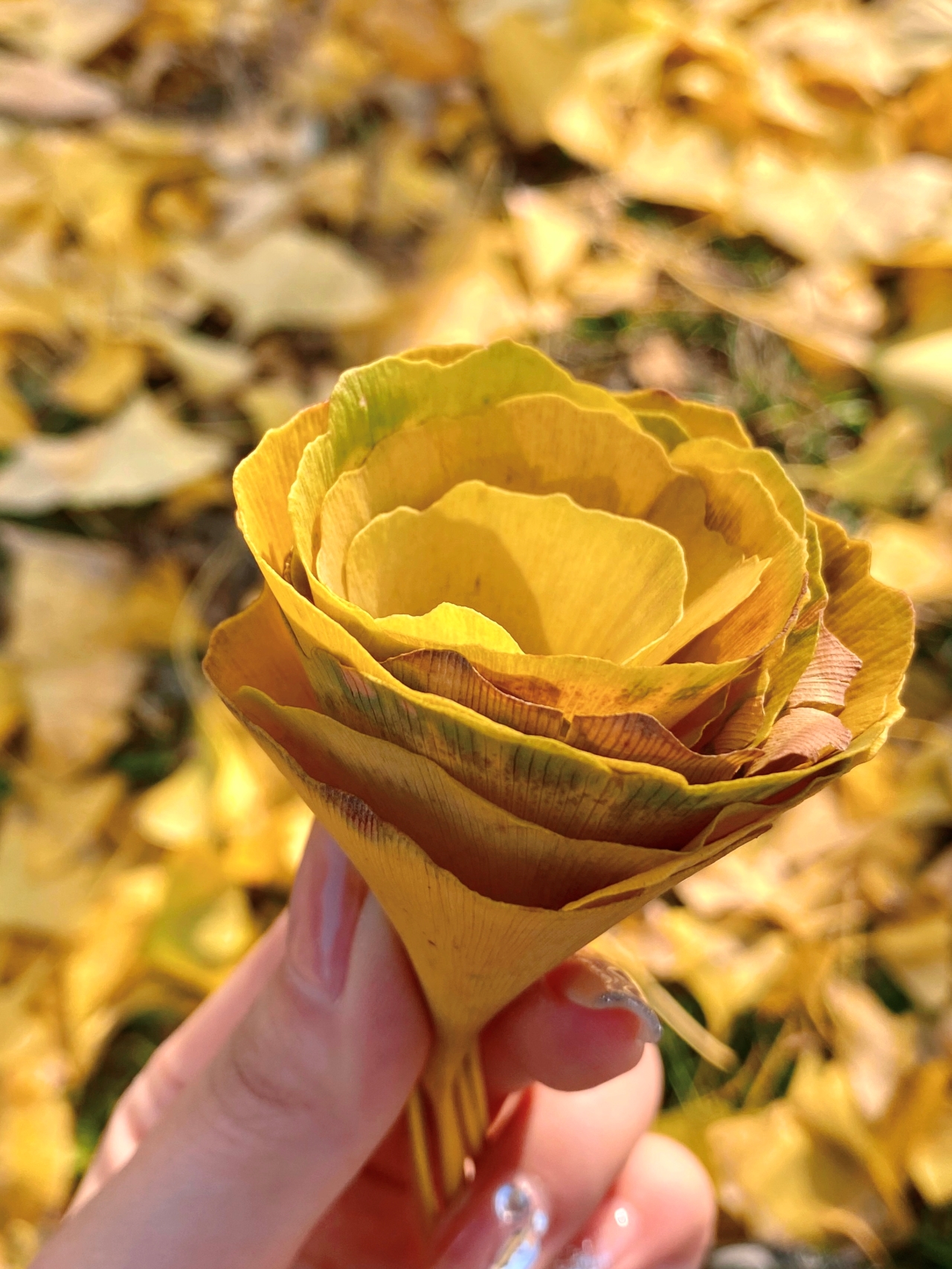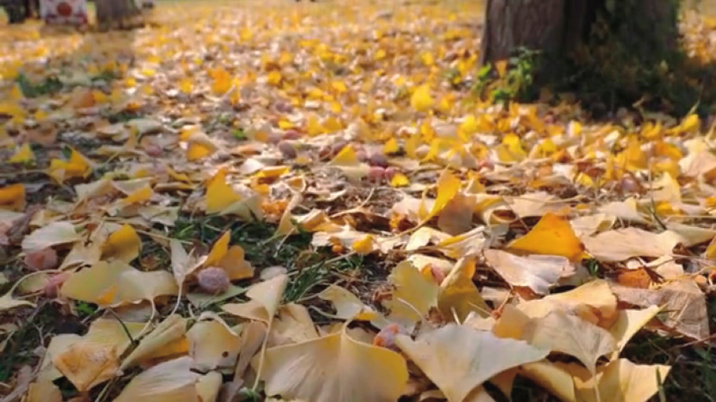 銀杏樹的果實也是像熟透了的荔枝一樣,圓圓的、淺黃的,密密麻麻結滿在綠蔭下,直叫人想跳起來,采摘了一粒放進嘴里。有時候還會被自然掉落的銀杏果砸中,大家嘴里也沒有一句抱怨,而是趕緊告訴同行的人快看,自己仿佛像個被好運砸中的幸運兒。