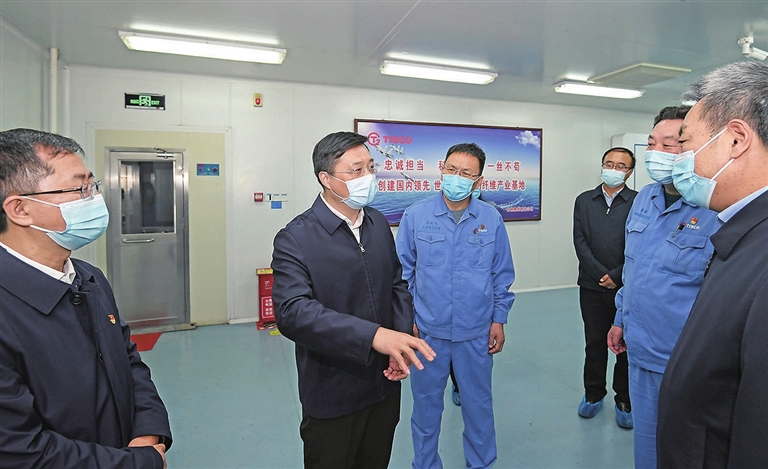 省委常委、副省長(zhǎng)、市委書記韋韜在山西鋼科碳材料有限公司調(diào)研T800級(jí)碳纖維一號(hào)線生產(chǎn)情況。梁琛攝