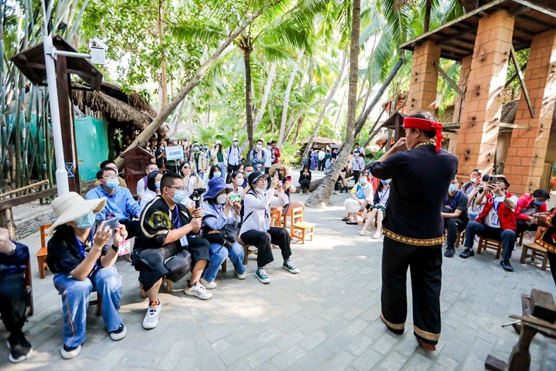 “咦,那是什么樂器?這么清脆獨特?”循著聲音,記者編輯走近一看,看到非遺傳承人正吹奏和彈奏著鼻簫、椰胡和木琴等之前從未見過的樂器。得知這個樂器是用竹子制成的富有黎族特色的邊棱氣鳴樂器,和其他用嘴吹奏的簫不一樣的鼻簫后,網(wǎng)媒記者編輯紛紛體驗鼻簫這一神奇的樂器。