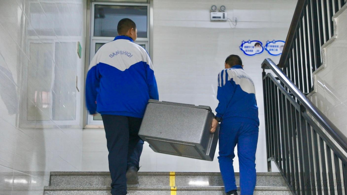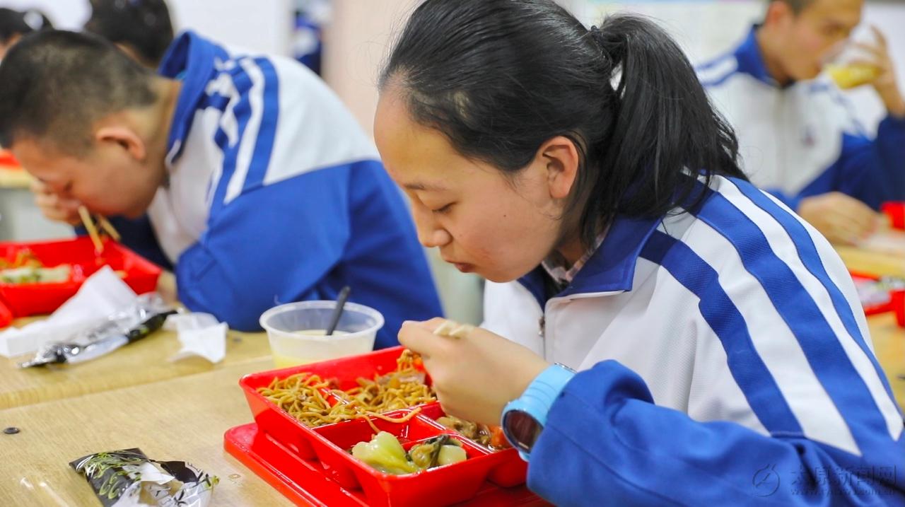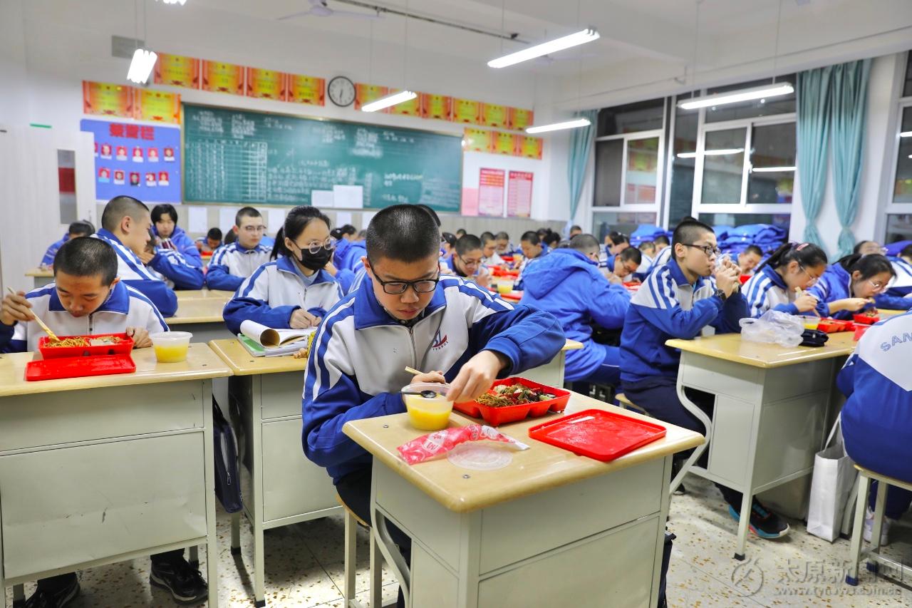 在太原市三十七中,每天傍晚6:30至6:45是初三年級學生的晚餐時間。一份熱氣騰騰的營養(yǎng)餐,給孩子們即將開始的晚自習提供滿滿的能量。
