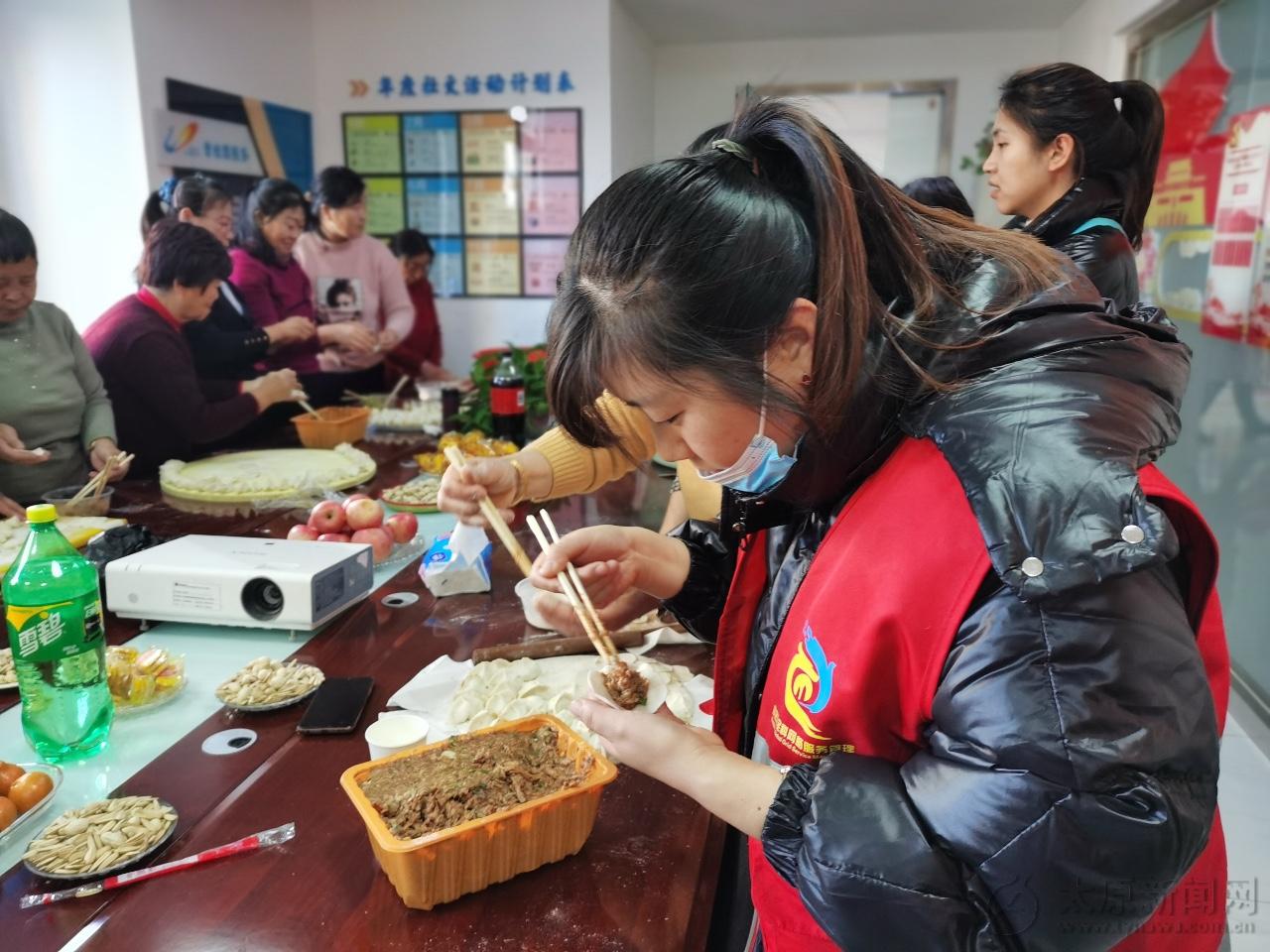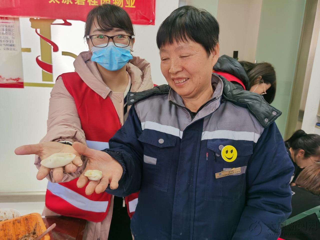 碧桂園物業會議室成了臨時廚房,大家一來便紛紛“搶占”自己的一席之地。大家分工明確,洗菜、攪餡,和面、搟皮、包餃子,一片歡樂祥和的幸福畫面。居民李大姐對網格員趙麗敏說:“閨女,你包的那餃子好看了么,咋包了?”大家相互比拼,相互切磋,彼此比較著餃子的形狀,活動現場異常熱鬧。