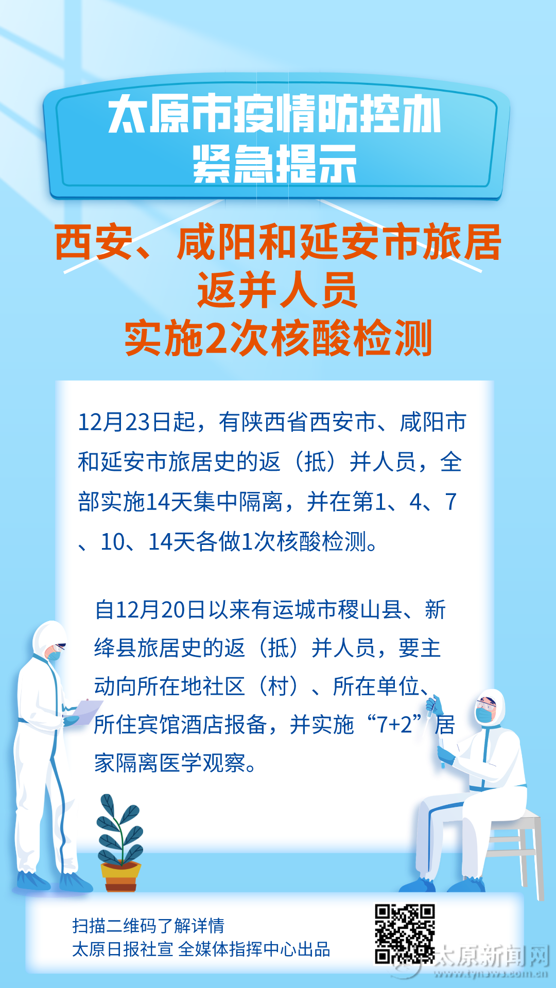 新聞海報:太原市疫情防控辦緊急提示:西安、咸陽和延安市旅居返并人員實施2次核酸檢測