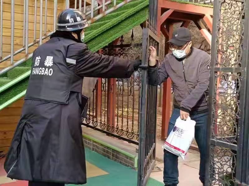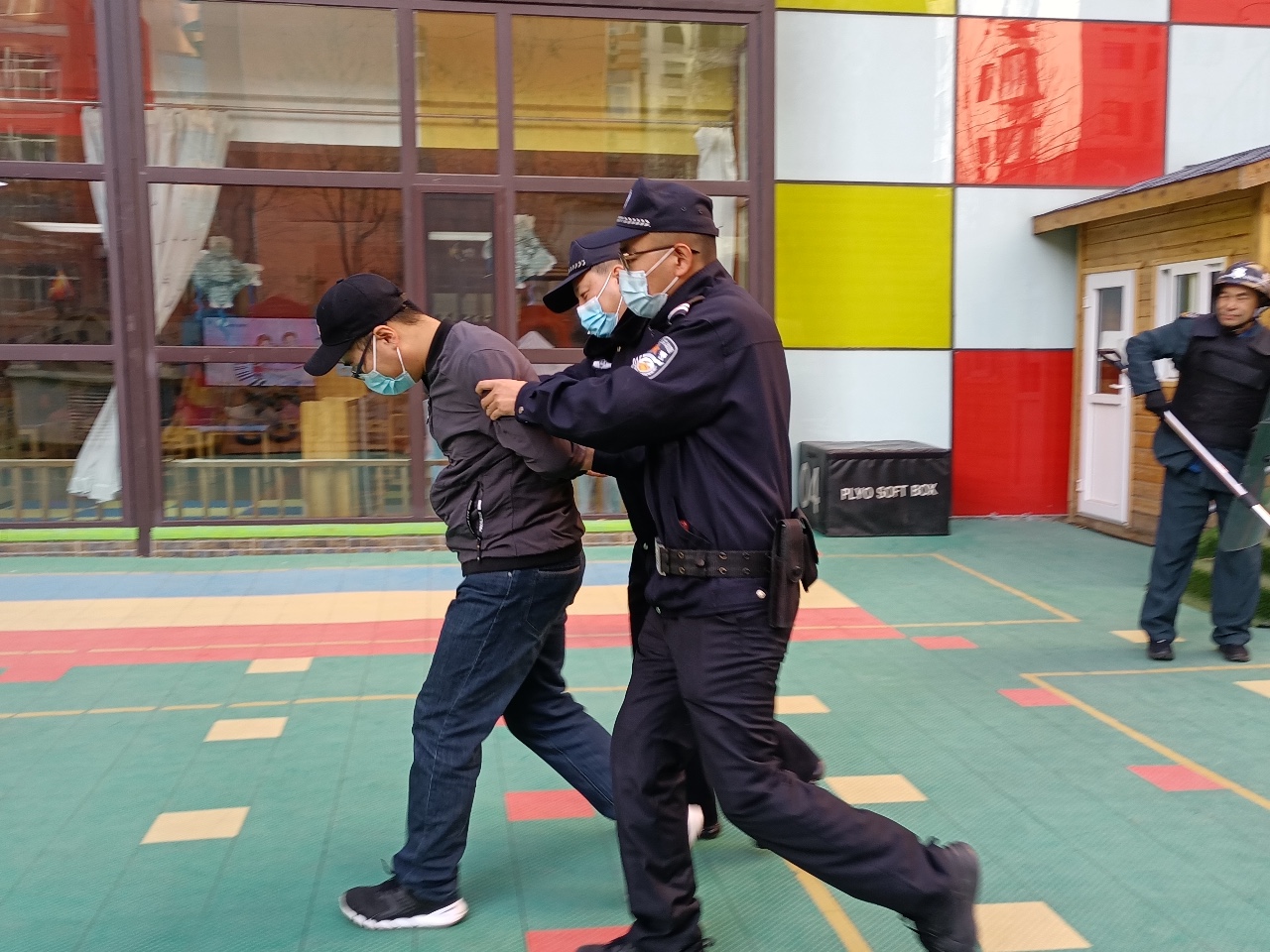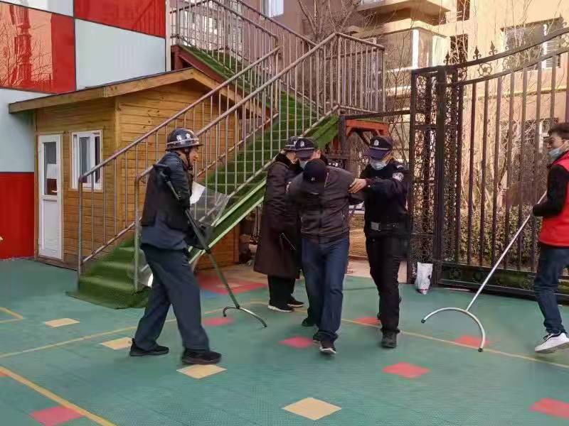 見此情形,保安員及護學崗成員立即拿起防衛器械與“歹徒”周旋、對抗,成功將犯罪分子逼入死角,阻止其靠近學生。與其同時,保安員快速反應,通過校園一鍵報警裝置,通知公安機關。很快,大東關派出所民警趕到幼兒園,在保安員、護學崗成員的配合下,將不法分子制服……