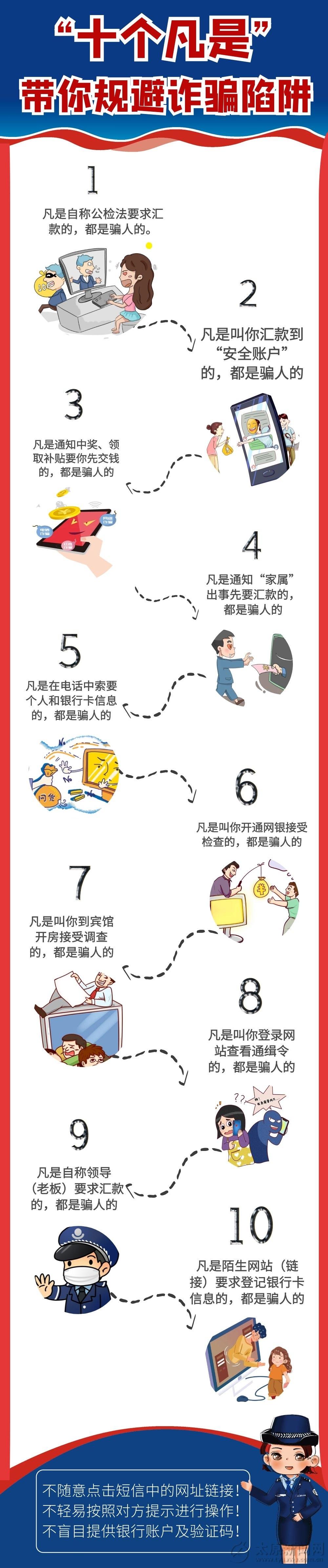 隨著互聯網不斷發展,與人民生活緊密連接,詐騙形式也由傳統的電話詐騙,轉向手法多樣、花樣更新的電信詐騙,詐騙手段不斷呈現多樣化的趨勢,對于人民群眾的財產安全也產生了巨大威脅。這“十個凡是”帶你規避詐騙陷阱!