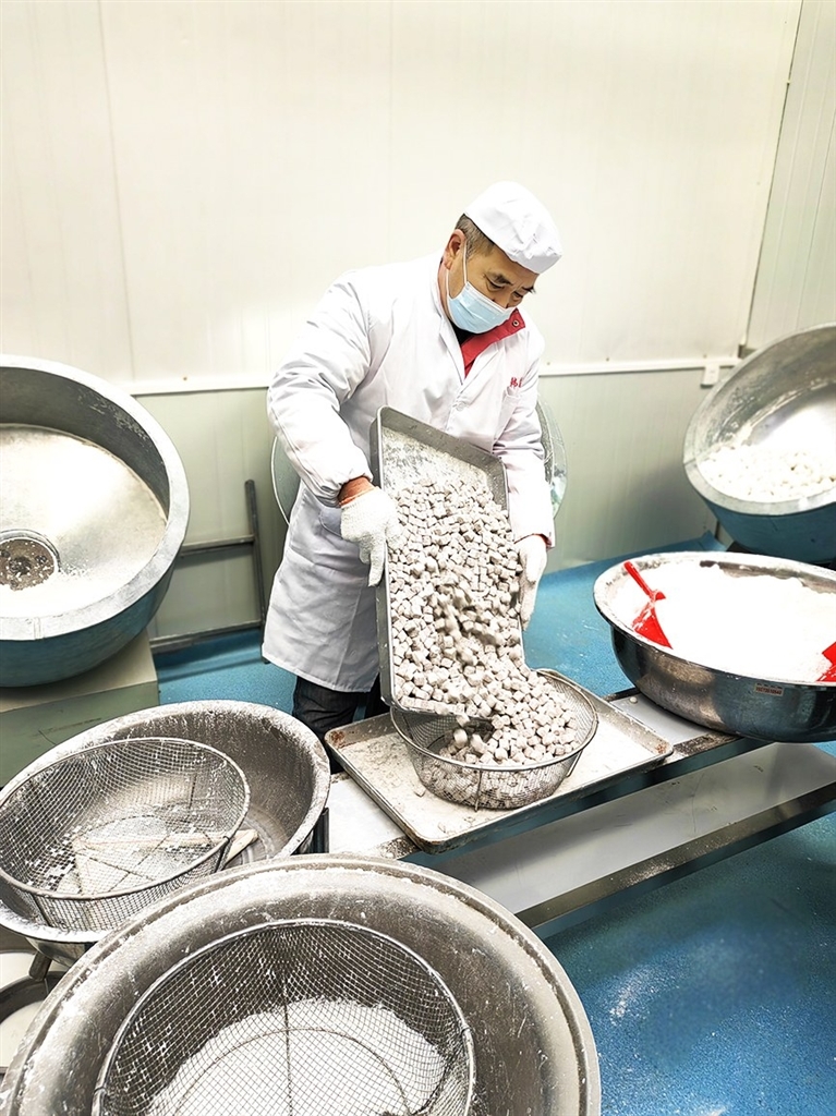 同樣被韓福元帶動制作元宵的還有杜鵬程。在晉祠鎮索村東一座現代化標準化元宵加工廠房內,34歲的杜鵬程和工人們一起忙著滾元宵。杜鵬程介紹說,自己從2017年開始做市場調查,遍訪當地制作元宵的老人,專心研制配料配方。當年底,其元宵一經推出,便受到市民青睞,每天銷售近10萬顆。“每年都有老顧客通過快遞來買元宵,因此我們定制了塑料托盤包裝,以解決元宵長途運輸易碎的難題。這樣,大家收到后不僅能品嘗出最正宗的年味,其中更飽含了親人的溫暖。”杜鵬程說。