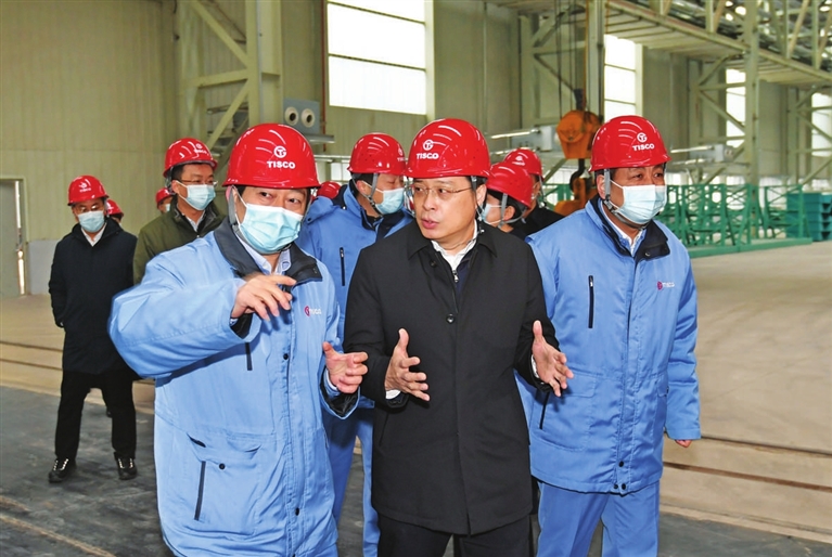 太原鋼鐵(集團(tuán))有限公司是集鋼鐵生產(chǎn)、加工、配送和貿(mào)易等為一體的特大型鋼鐵聯(lián)合企業(yè)。韋韜來(lái)到冷軋硅鋼廠(chǎng),在高端冷軋取向硅鋼生產(chǎn)線(xiàn)前實(shí)地察看試生產(chǎn)情況,就工藝流程、產(chǎn)能產(chǎn)量、市場(chǎng)需求等與企業(yè)負(fù)責(zé)人深入交流;步入技術(shù)中心展廳,聽(tīng)取科研攻關(guān)、技術(shù)革新、節(jié)能環(huán)保等工作匯報(bào),觀(guān)看代表性產(chǎn)品行業(yè)應(yīng)用展示。他對(duì)太鋼集團(tuán)長(zhǎng)期以來(lái)為太原經(jīng)濟(jì)社會(huì)發(fā)展作出的貢獻(xiàn)表示感謝,希望企業(yè)進(jìn)一步調(diào)整優(yōu)化產(chǎn)品結(jié)構(gòu),增加不銹鋼、取向硅鋼等高端產(chǎn)品生產(chǎn)比重,強(qiáng)化材料深加工匹配能力,不斷提高附加值。加大科技研發(fā)力度,注重人才隊(duì)伍建設(shè),大力開(kāi)發(fā)多系列多領(lǐng)域應(yīng)用的特種鋼,推進(jìn)高性能碳纖維產(chǎn)品工藝研發(fā)和批量化生產(chǎn),持續(xù)提升產(chǎn)品的核心競(jìng)爭(zhēng)力和市場(chǎng)占有率。積極推進(jìn)減污降碳,強(qiáng)化節(jié)能減排新技術(shù)研發(fā)應(yīng)用,有效控制能耗和排放強(qiáng)度,全面提升綠色發(fā)展水平。提高集聚集群能力,加大對(duì)產(chǎn)業(yè)鏈上下游企業(yè)招引力度,帶動(dòng)相關(guān)配套企業(yè)落地,加快產(chǎn)業(yè)集聚,做強(qiáng)產(chǎn)業(yè)集群。