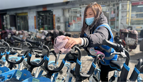 張女士主要負責所管轄區域內單車的定點擺放和城管事件的處理工作。每天到達工作地點后,張女士需要先把路上亂停亂放的車輛擺放好,然后再進行一天中最重要的工作——給路面車輛消毒。近期太原疫情形勢緊張,為了保障市民的騎車安全,張女士會對車把、車座等與市民接觸最頻繁的地方進行重點消殺。