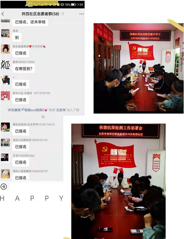 4月6日15:30,并四社區黨委接上級任務于當晚進行全區全員抗原體檢測,社區黨委積極響應號召,崔榮書記立即召開核酸抗原體檢測工作部署會,并集中學習核酸抗原檢測教程,因時間緊,任務重,社區急需大量志愿者加入,一時間,一條緊急志愿者招募的信息在各個網格群傳開,來自各個網格的志愿者在群內接龍刷屏,踴躍報名。報名志愿者的人數快速上升。當晚,由60余名黨員志愿者組成的防疫隊伍迅速組建完成。