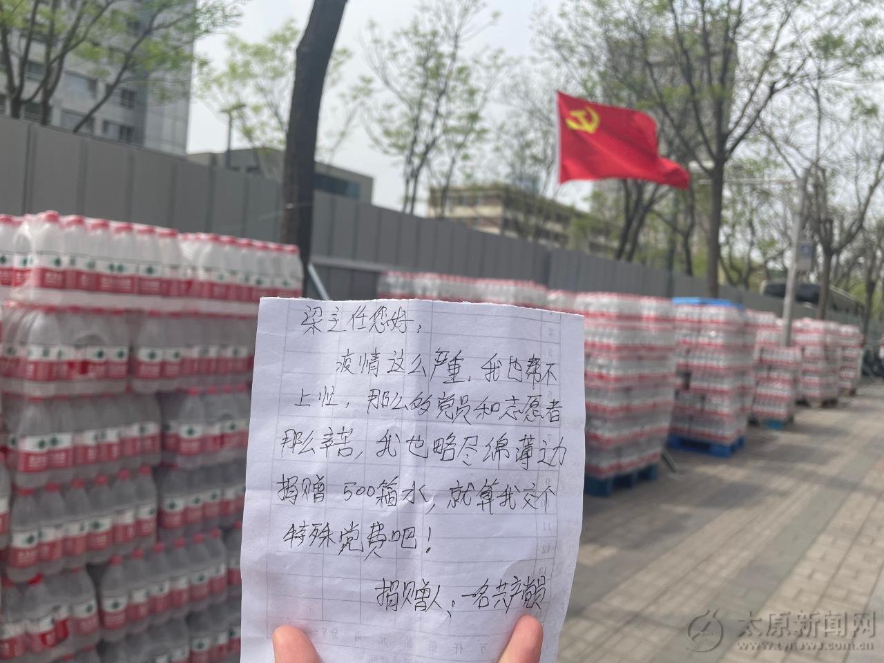 “疫情這么嚴重,我也幫不上忙,那么多的黨員和志愿者那么辛苦,我也略盡綿薄之力,捐贈500箱水,就算我交個特殊黨費吧!”落款:一名共產黨員。