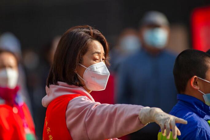 (杏花嶺區勁松路核酸檢測點工作人員正在引導群眾進行核酸檢測)