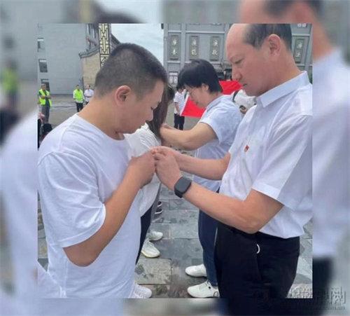 董鈺柱書記和岳瑞芝書記為13名新入黨黨員佩戴黨徽。