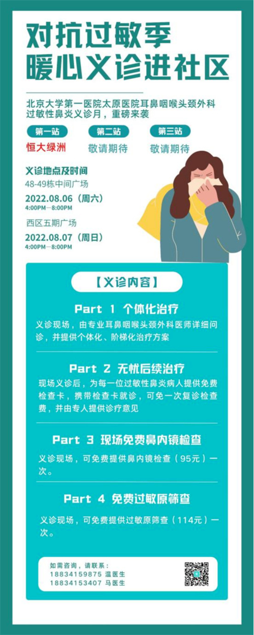 為應(yīng)對(duì)市民日益高發(fā)的過敏性疾病發(fā)病情況,減輕患者診療負(fù)擔(dān),北京大學(xué)第一醫(yī)院太原醫(yī)院(太原市中心醫(yī)院)耳鼻喉頭頸外科汾東病區(qū)將開展大型義診活動(dòng)。