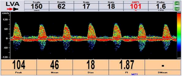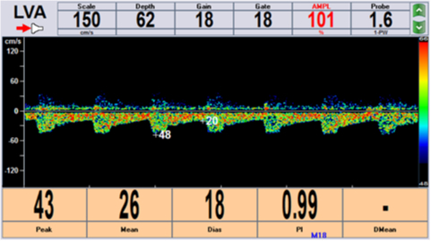 ▲經顱多普勒超聲示左鎖骨下動脈重度狹窄時左側椎動脈血流完全反向