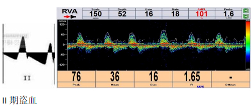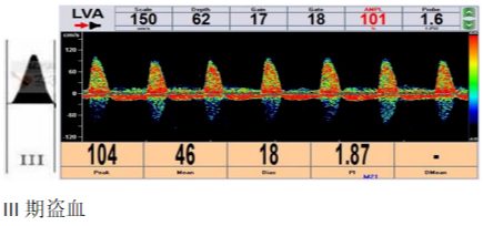 Ⅲ期:完全型竊血,患者除上肢供血不足還有眩暈、黑曚甚至共濟失調表現,此時椎動脈血流完全反向。