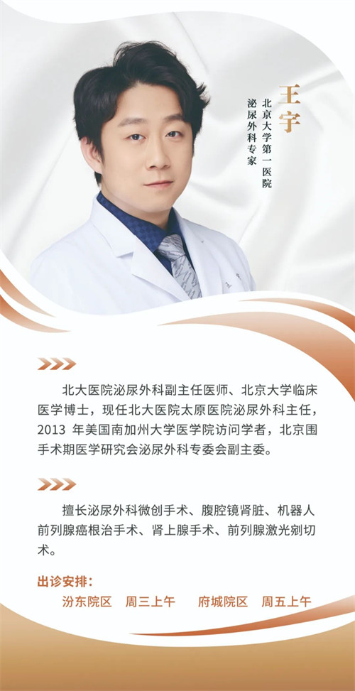 北大醫院腎內科許戎、心內科李康、皮膚科楊淑霞、泌尿外科王宇已長期入駐北大醫院太原醫院(太原市中心醫院)并在門診長期出診啦,請有需要的患者預約就診!