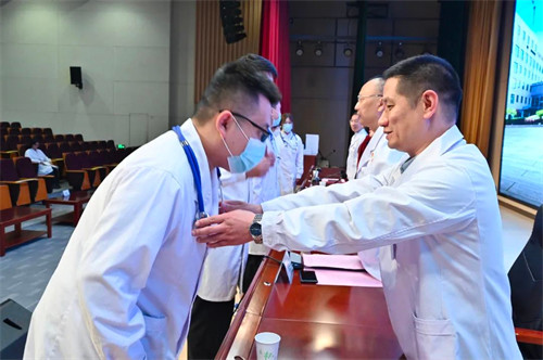 郭進(jìn)升鼓勵(lì)大家要樹立和踐行新時(shí)期的職業(yè)精神,要立德為先,牢記責(zé)任擔(dān)當(dāng),秉承家國(guó)情懷;要不斷提高自身的醫(yī)學(xué)理論知識(shí)和技能操作水平,努力提高解決臨床實(shí)際問題的能力;樹立醫(yī)德醫(yī)風(fēng),關(guān)注人文關(guān)懷,不斷加強(qiáng)救死扶傷的道術(shù)、心中有愛的仁術(shù)、知識(shí)扎實(shí)的學(xué)術(shù)、本領(lǐng)過硬的技術(shù)、方法科學(xué)的藝術(shù),成為醫(yī)德高尚、醫(yī)術(shù)精湛的人民健康守護(hù)者;嚴(yán)格自律,遵章守紀(jì),養(yǎng)成良好的職業(yè)習(xí)慣,確保醫(yī)療安全,開啟自己的醫(yī)之正道,成為德藝雙馨的好醫(yī)生!