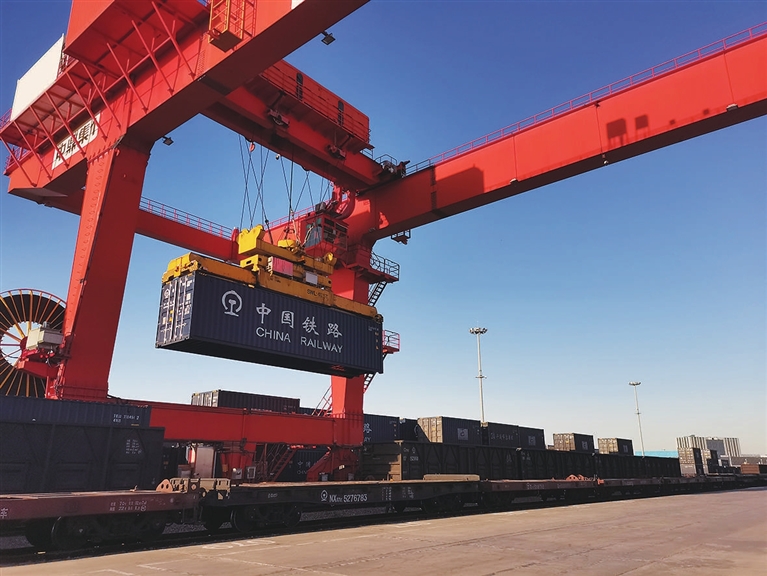 走進體量巨大的園區鐵路港,遠遠看到一個橘色的“大門框”高高聳立著,確有幾分像“龍門”。“龍門”主梁上用鋼絲繩掛著起重吊具,下方整齊碼放著一排排集裝箱。