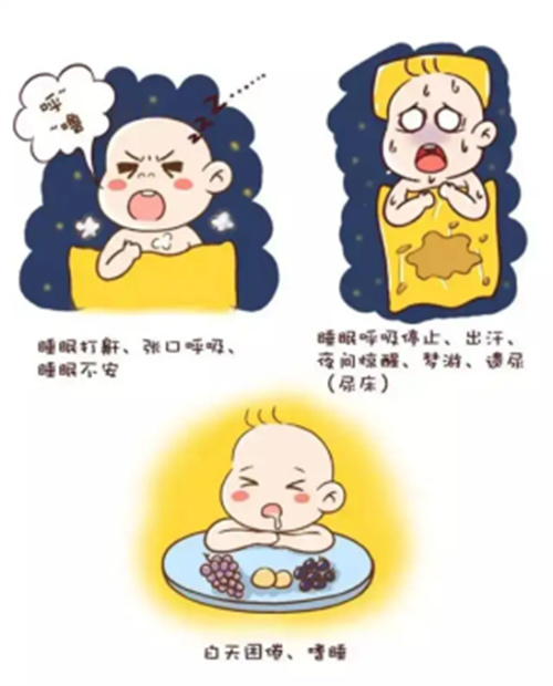 兒童阻塞性睡眠呼吸暫停可表現為:睡眠期間打鼾、張口呼吸、呼吸暫停、鼻翼煽動、夜間出汗、遺尿及體位異常等。