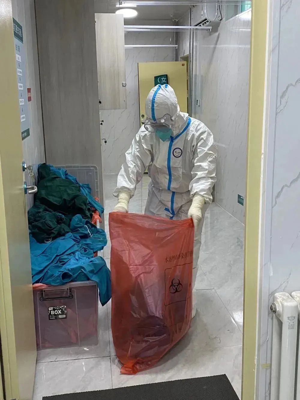 醫護人員進入到隔離區,防護是否到位?穿脫是否規范?陪檢組的監督工作就顯得尤為重要,陪檢組就是要把好進入方艙的第一關——穿防護服,細致檢查,保證進入隔離區醫護人員的自身安全,同時要保證患者的安全。最近已有不少患者朋友們陸續出院,陪檢組會為患者進行全面消殺,并送上新的醫用口罩,患者朋友安全出艙是所有人的心愿。