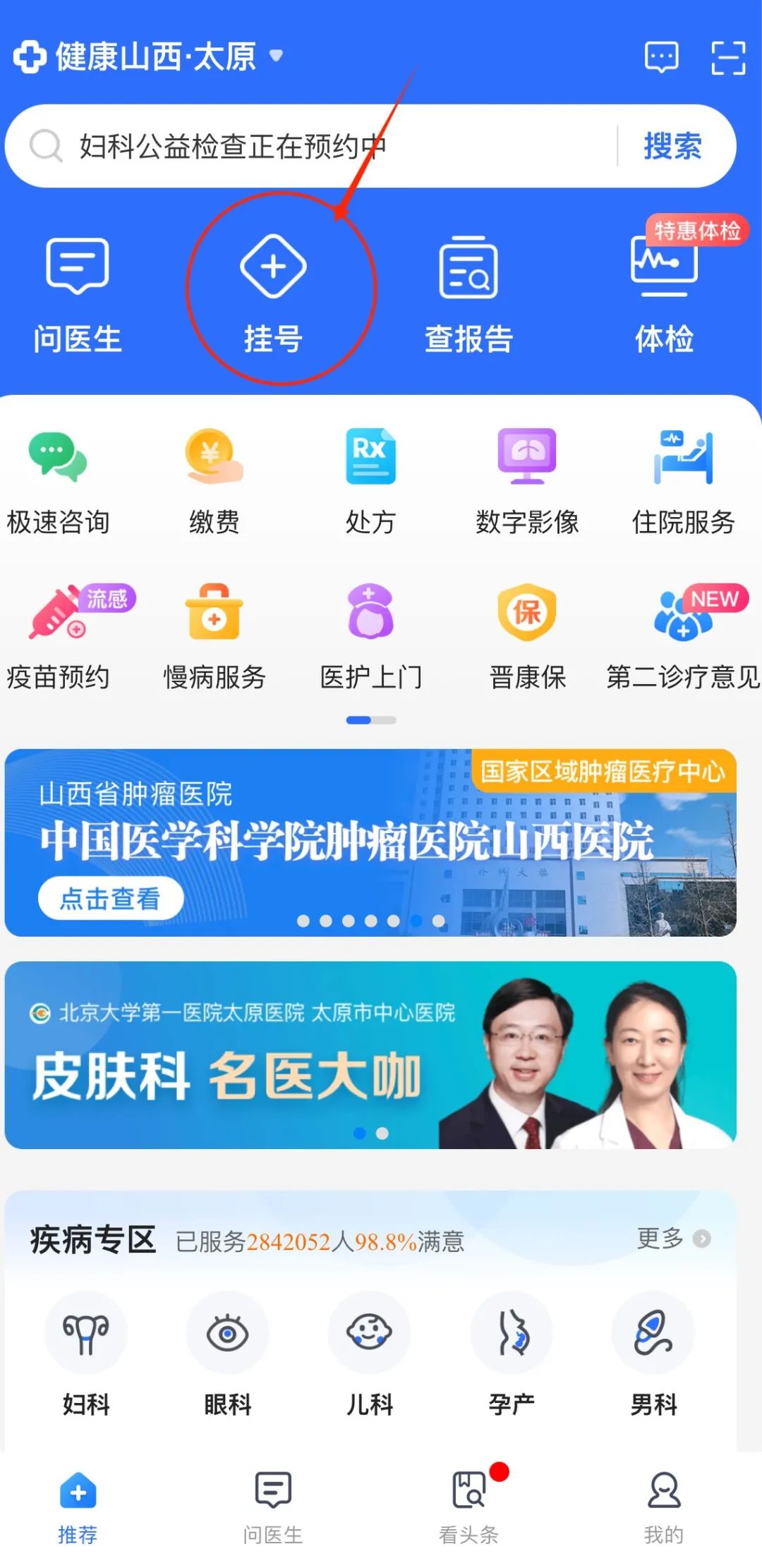 第一步:打開“健康山西app”→點(diǎn)擊“掛號(hào)”。