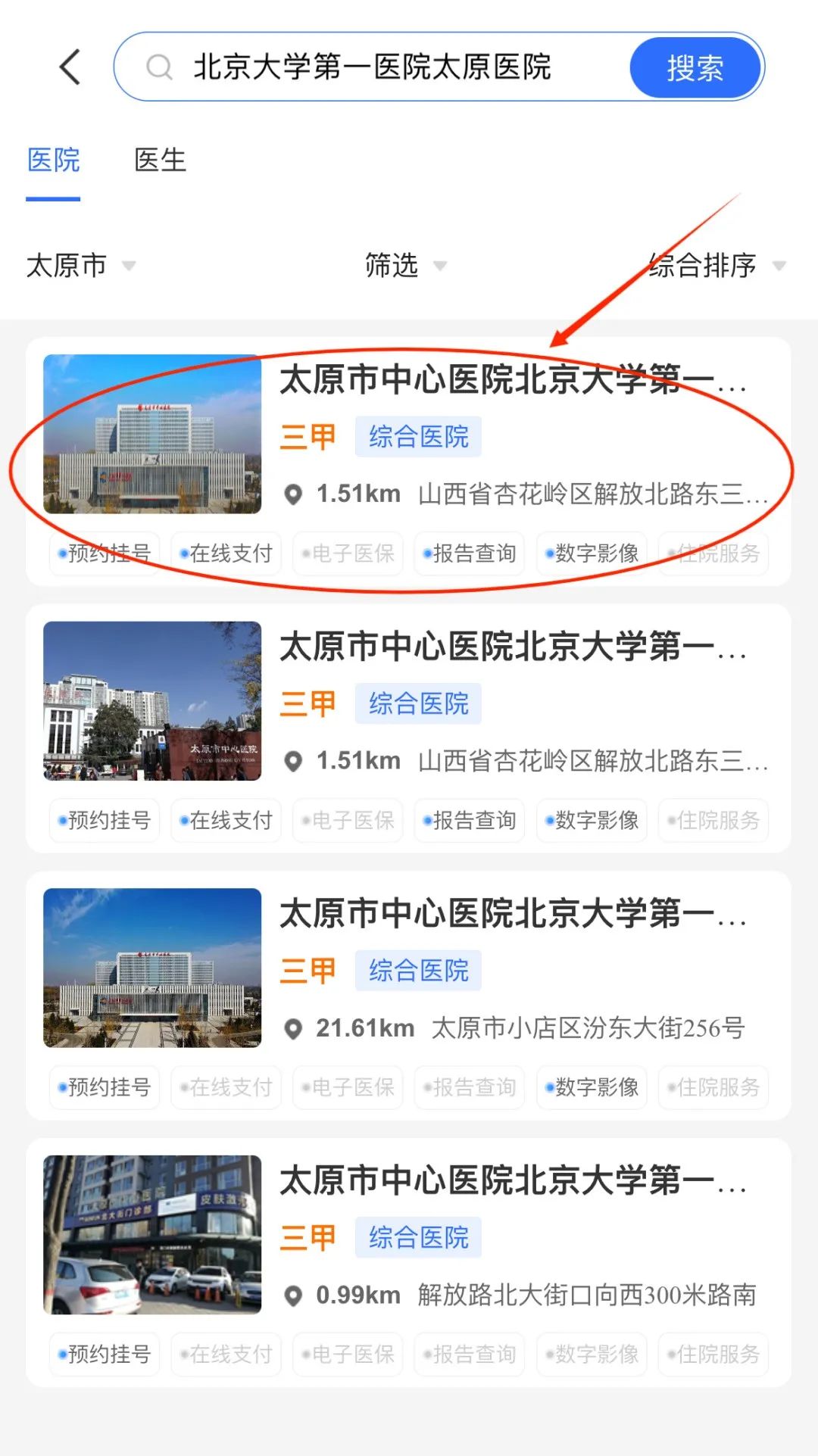 第二步:搜索“北京大學(xué)第一醫(yī)院太原醫(yī)院”。