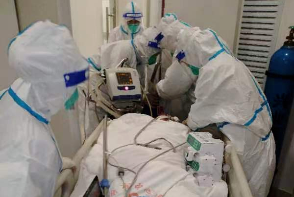 7床是剛收入院的一位新冠陽(yáng)性重癥肺炎患者,雙肺大面積感染,入院后生命體征不穩(wěn),血氧飽和度一直波動(dòng)于74%-80%,給予高流量吸氧裝置高濃度吸氧后,血氧飽和度無(wú)明顯改善。郭歡醫(yī)生冒著開(kāi)放氣道近距離接觸帶來(lái)的新冠病毒感染風(fēng)險(xiǎn),立即給予氣管插管、有創(chuàng)呼吸機(jī)輔助呼吸,同時(shí)開(kāi)通靜脈通路。由于搶救及時(shí),患者30分鐘后血氧飽和度逐漸上升至95%,生命體征平穩(wěn),病區(qū)的醫(yī)生、護(hù)士長(zhǎng)吁一口氣,防護(hù)服下的汗水見(jiàn)證了剛才的驚心動(dòng)魄。