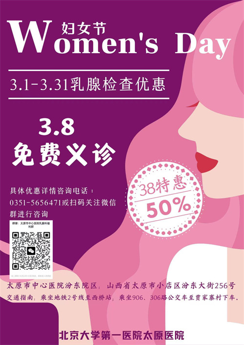 3月8日,將在北大醫院太原醫院(太原市中心醫院)汾東院區門診一層大廳舉行乳腺疾病免費義診