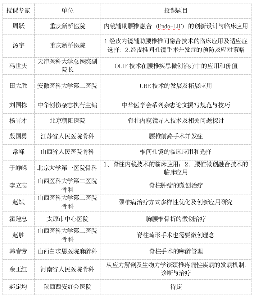 為進一步提高山西省骨科醫師對脊柱疾患微創治療相關技術的了解和掌握,并為山西省骨科醫師搭建一個交流學習的平臺,北大醫院太原醫院(太原市中心醫院)負責組織實施山西省人力資源和社會保障廳項目《關于公布2022年高級研修項目計劃的通知》(晉人社廳函〔2022〕482號),將于2023年3月11日-17日舉辦“脊柱疾患微創治療相關技術高級研修班”,旨在為脊柱微創技術的發展貢獻力量、添磚加瓦。