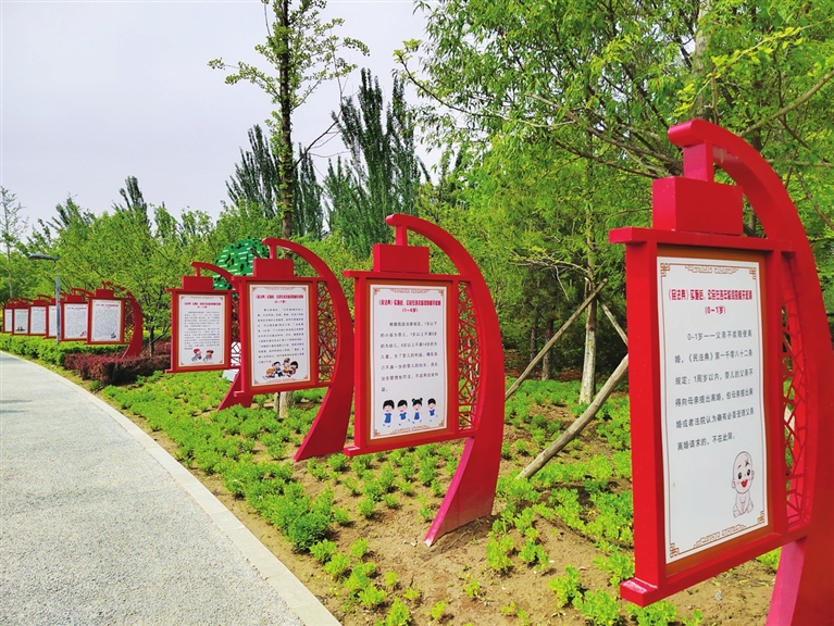 主題公園依景而建,一組巨大的紅燈籠造型宣傳展板,排列在樹叢間,展示了《民法典》實施后,公民在各年齡段的相關權利,言簡意賅,將法治文化理念與現有環境綠化相融合,讓居民在休閑娛樂中潛移默化地掌握法律知識,零距離接受法治文化的熏陶。
