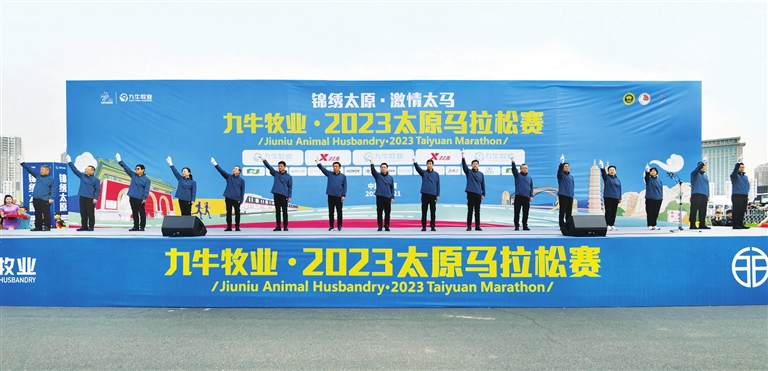 韋韜、熊繼軍等為2023太原馬拉松賽鳴槍發令。梁琛 攝