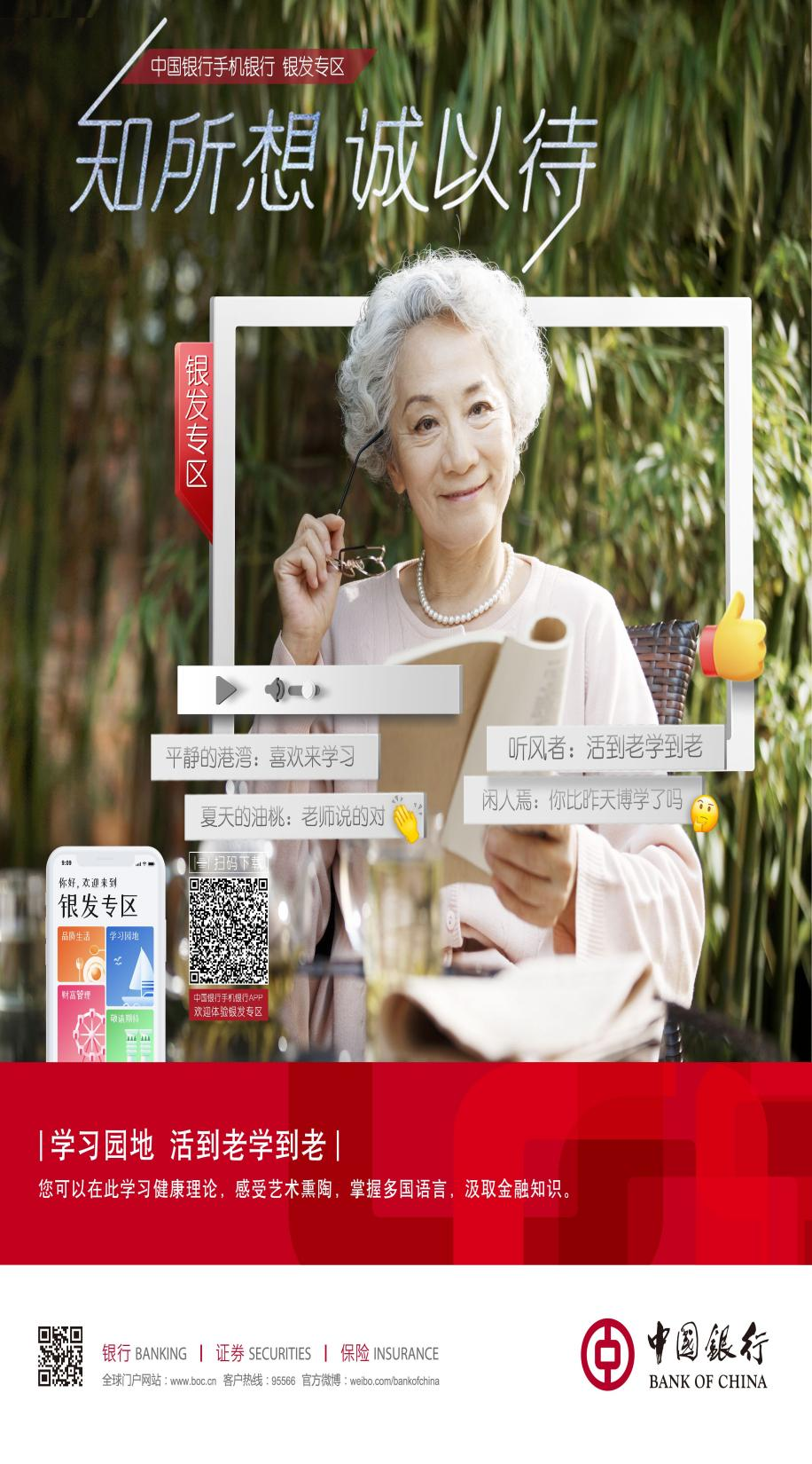中國銀行積極擁抱銀發(fā)經(jīng)濟,在金融行業(yè)率先扛起數(shù)字化養(yǎng)老大旗。通過公益養(yǎng)老、文化養(yǎng)老、智慧養(yǎng)老等多元化養(yǎng)老戰(zhàn)略,探索創(chuàng)新金融服務與新時代養(yǎng)老的合作模式,幫助銀發(fā)用戶跨越數(shù)字鴻溝,樂享時代美好生活。老吾老以及人之老,服務好老年客戶,為老年客戶辦實事,讓老年人享受數(shù)字時代帶來的金融紅利,是中行人義不容辭的責任與義務。