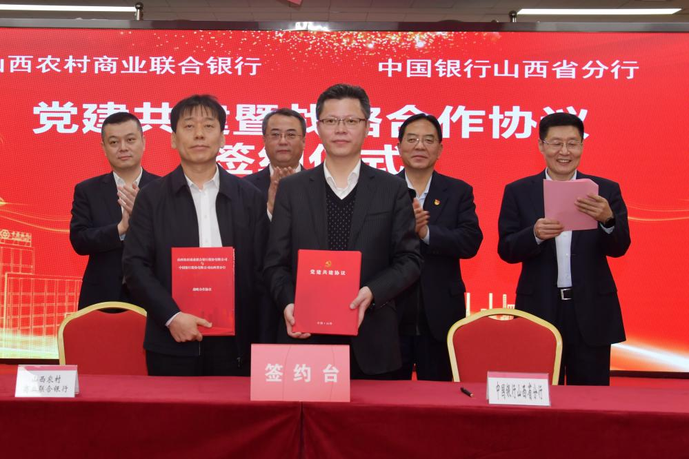 中國銀行山西省分行副行長劉溟與山西農村商業聯合銀行副行長聶紅偉分別代表雙方簽署黨建共建及戰略合作協議。