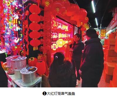 陽光下,對聯(lián)攤?cè)缁▓F錦簇的片片紅梅海,燈籠攤?cè)衾_紛絢麗的串串七彩果,加之偶有熱氣蒸騰而上,濃郁的人間“煙火氣”在小商品批發(fā)市場彌漫。
