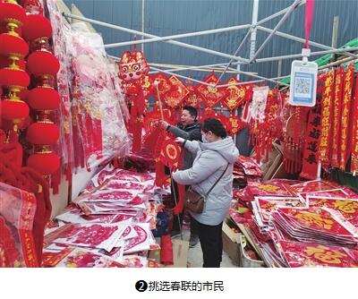 多家春聯(lián)銷售攤位前,人頭攢動,詢價問貨,好不熱鬧。“我們每天早上8點就開門營業(yè),到晚上7點多才收攤。從臘八前后開始,生意越來越好。臨近年根兒,顧客越來越多,我們生意做得也特別有勁兒!”問及今年最受歡迎的商品,靠近市場北門的春聯(lián)攤攤主張大姐說:“最緊俏的是新出的磁吸式對聯(lián),因為現(xiàn)在大家都住在單元樓里,比起以往需要膠粘的紙質(zhì)春聯(lián),這種春聯(lián)可以直接吸在外門上,方便簡單,而且還不會留下難以處理的膠水印,特別受歡迎。”