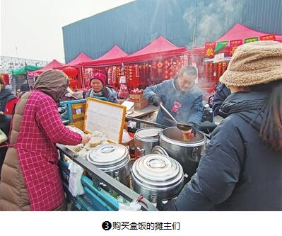 臨近中午,各個攤位前還是有不少顧客在選購年貨,攤主們?yōu)榱瞬挥绊懮猓歼x擇就近買點兒包子或者盒飯現(xiàn)場解決午飯問題。
