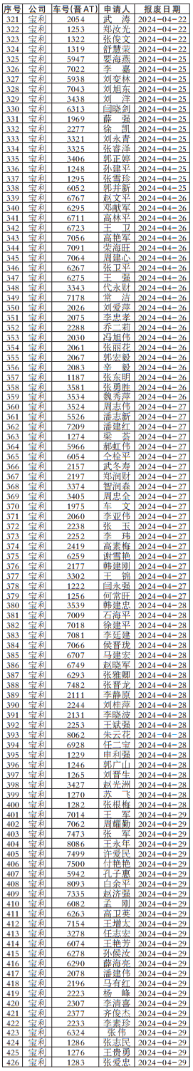 按照《太原市客運出租汽車服務管理條例》等有關規定,我公司對提出車輛更新申請的巡游出租汽車經營者申報材料進行了核實,現對符合條件的經營者名單(第一批426人)予以公示,公示期為2024年4月10日-2024年4月14日,公示期間,若巡游出租汽車經營者及社會各界對上述車輛經營者資格有異議,均可來電反映。