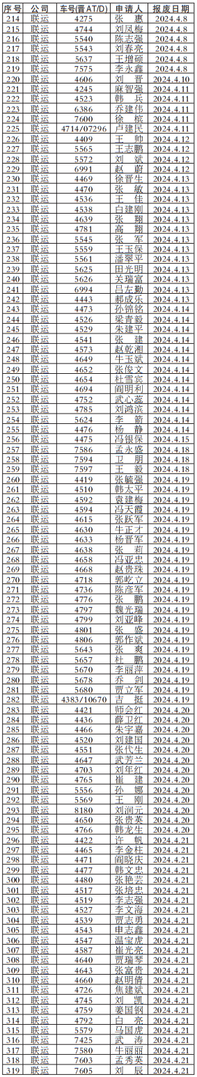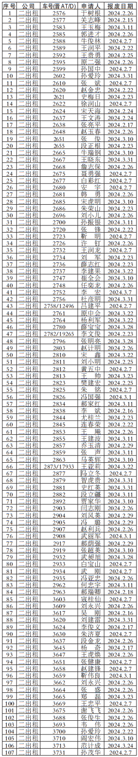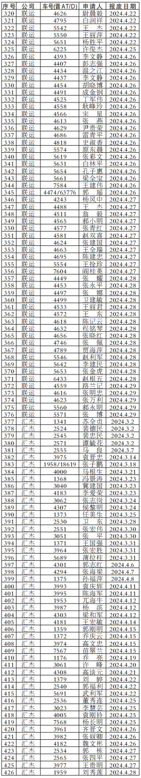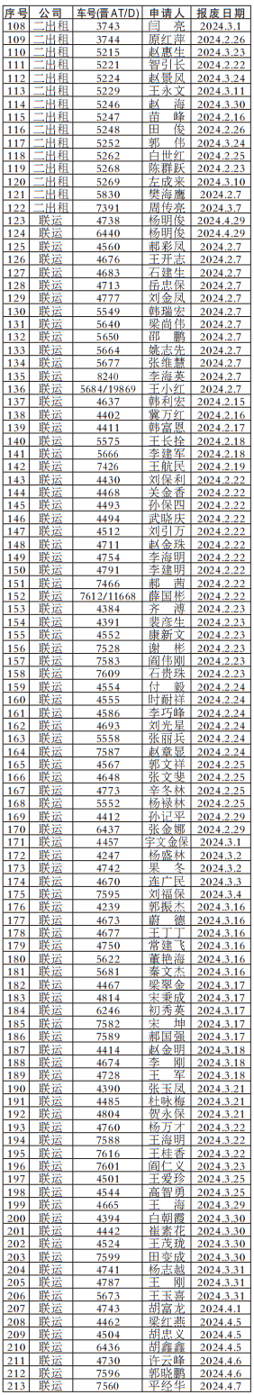 按照《太原市客運出租汽車服務管理條例》等有關規定,我公司對提出車輛更新申請的巡游出租汽車經營者申報材料進行了核實,現對符合條件的經營者名單(第一批426人)予以公示,公示期為2024年4月10日-2024年4月14日,公示期間,若巡游出租汽車經營者及社會各界對上述車輛經營者資格有異議,均可來電反映。