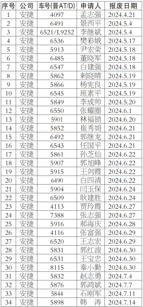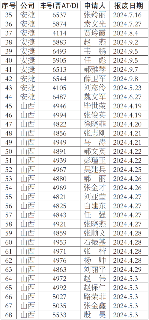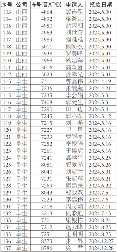 按照《太原市客運出租汽車服務管理條例》等有關規定,我公司對提出車輛更新申請的巡游出租汽車經營者申報材料進行了核實,現對符合條件的經營者名單137人予以公示,公示期為2024年4月29日-2024年5月3日,公示期間,若巡游出租汽車經營者及社會各界對上述車輛經營者資格有異議,均可來電反映。