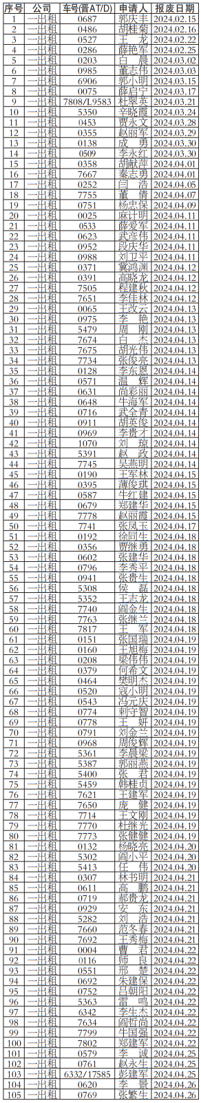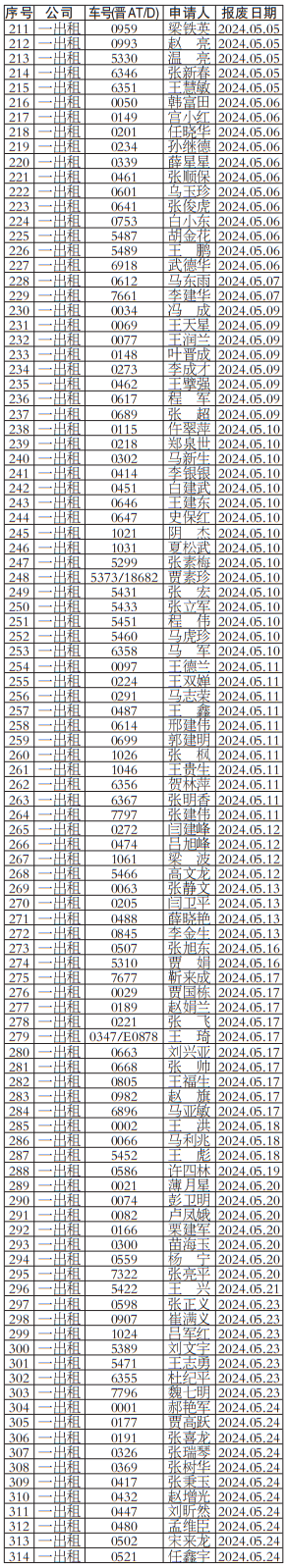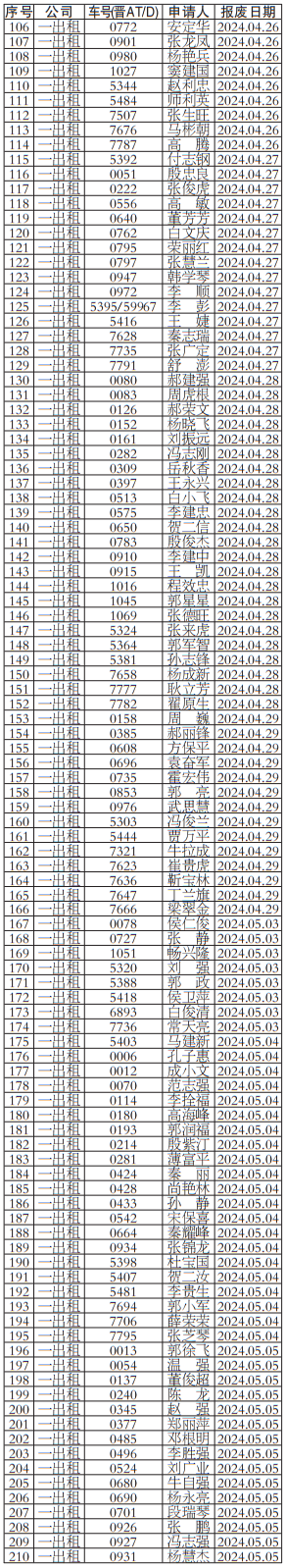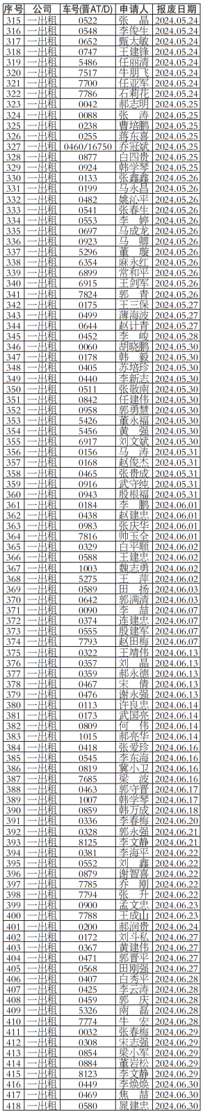 按照《太原市客運出租汽車服務管理條例》等有關規定,我公司對提出車輛更新申請的巡游出租汽車經營者申報材料進行了核實,現對符合條件的經營者名單418人予以公示,公示期為2024年4月30日-2024年5月4日,公示期間,若巡游出租汽車經營者及社會各界對上述車輛經營者資格有異議,均可來電反映。
