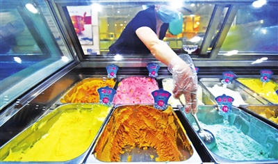 “年輕時就經常來,點杯酸甜可口的沙棘冰激凌尤其過癮?!傲胰债斂?,在雪山冷飲廳一層大廳,一對60多歲的老夫婦正陪著五六歲的小外孫解饞,桌上晶瑩剔透的玻璃杯中,色彩各異的冰激凌球令人垂涎?!把┥健北ち栀|地均勻、口感柔滑卻不失回味,鮮奶冰激凌、沙棘冰激凌兩大招牌,跨越30多年味道如一。入口濃醇奶香、沙棘酸甜襲來,沁涼浸舌尖,余味悠長。如今,雪山冰激凌的種類已多達50余種,陳醋、提拉米蘇、海鹽焦糖、希臘酸奶等新口味冰激凌,不僅給老顧客帶來驚喜還吸引了不少“新粉絲”,并且拒絕防腐劑、添加劑,這是“雪山”的承諾。