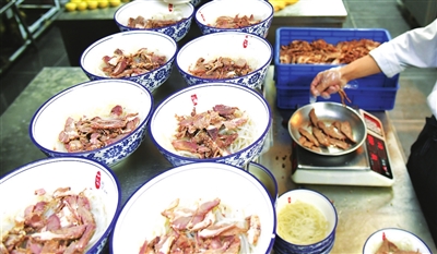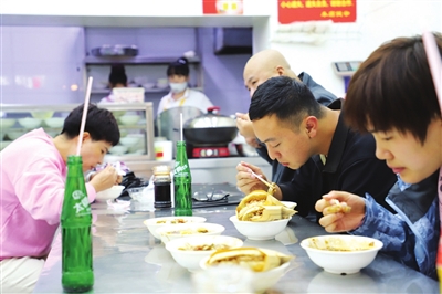 每日清晨4時,楊記灌腸的師傅們就開始手工和面。面和好后,定量攪進一個個淺口碟子里,擺放進蒸籠。出籠的灌腸須晾一兩個小時,成型以后再用鏟子盛出來,確保筋道不糊。一碗正宗灌腸,一勺醬鹵汁、一撇油辣子,是點睛之筆。吃的時候,沿著碗邊兒,小股兒再倒點老陳醋,切成條狀的灌腸,均勻裹滿醬香濃稠的鹵汁,送入口中那滿足感,是每一個太原人不能忘懷的家鄉味道。外地“寶子們”來品嘗,無論大口吞食,或小口細品,都能完美俘獲味蕾。