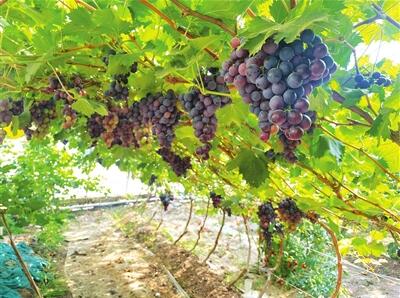 這個示范園占地面積1300余畝,建有366個溫室大棚,其中一半以上種葡萄,有蜜光、藍寶石、玉龍玫瑰等品種。“我們種葡萄5年了,大棚內光照充足、利通風,葡萄長得好,單棚年產量都在5000公斤以上。”村民常大媽介紹,這里葡萄的采摘期較長,每年5月至10月都能采摘。