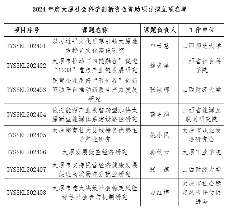 2024年度太原社會科學創新資金資助項目立項評審工作現已結束,經過專家評審,擬對8個課題項目予以立項(見名單),現進行公示。公示時間為2024年7月18日—24日,對公示對象有任何反映,請與太原市社科聯聯系。電話:0351-3337499。